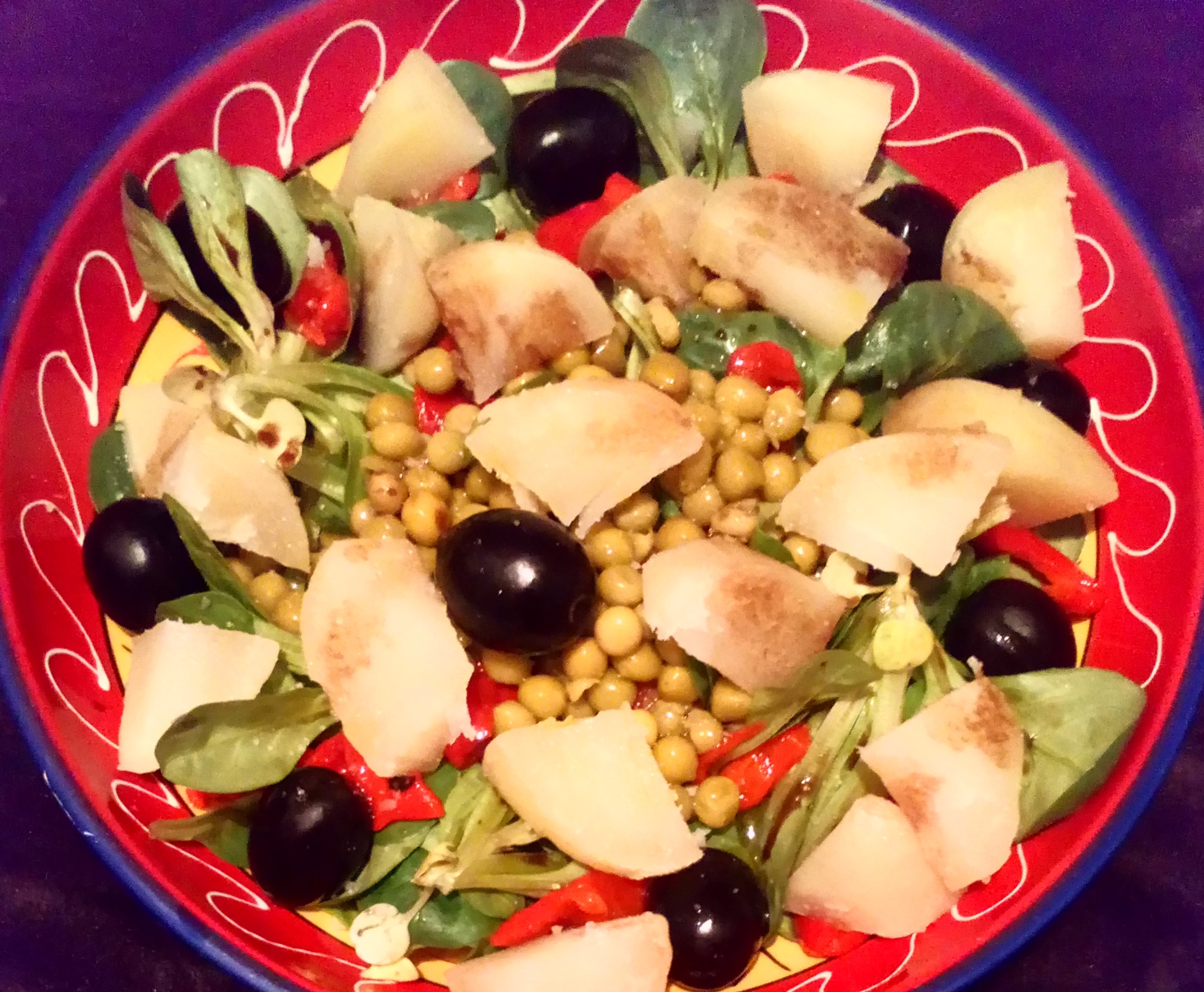Qué difícil es definir una ensalada. Me ha costado encontrar un título para esta, porque no es que haya un ingrediente que destaque más que los demás, aunque creo que los canónigos, la patata y los guisantes son los protagonistas en esta preparación, pero hay más.