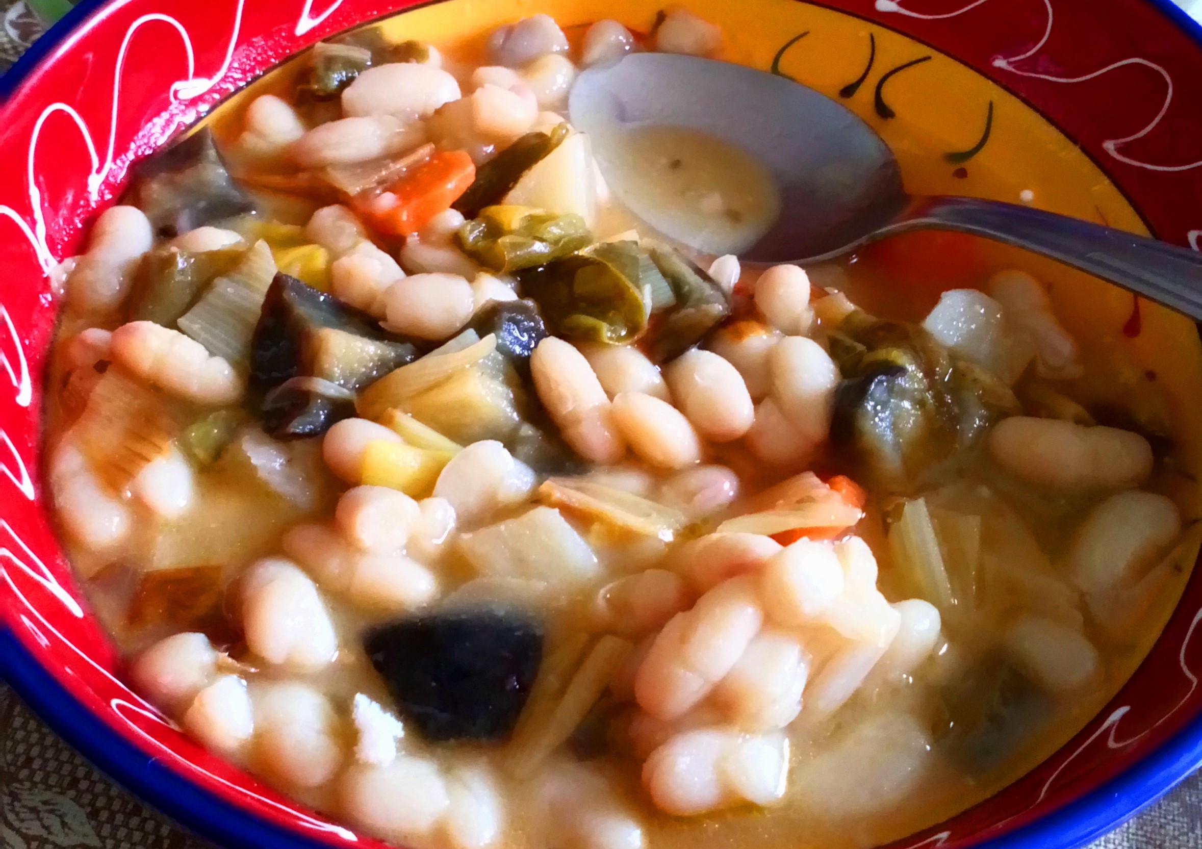 Para acompañar a estas alubias, utilicé todas las verduras que tenía en la nevera: zanahoria, pimiento, berenjena y puerro, las cuales salteé en una sartén con aceite de oliva virgen extra y sal hasta que se ablandaron. Acto seguido, pelé una patata, la corté en trozos y la añadí al salteado con un poco de ajo en polvo y perejil. Después, pasé la mezcla a una cazuela y añadí agua. Cuando esta hirvió, añadí las alubias de bote con una hoja de laurel y una pastilla de caldo vegetal y dejé que se cocinaran unos minutos más, hasta que el caldo adquirió una consistencia más espesa, que es muy fácil de lograr con las alubias en conserva. Esta preparación puede dar para varias raciones, y a mí me duró unos tres días, con lo que solamente tuve que invertir el poco tiempo que tardé en cocinarlas, y el resto de días, únicamente tuve que calentarlas.